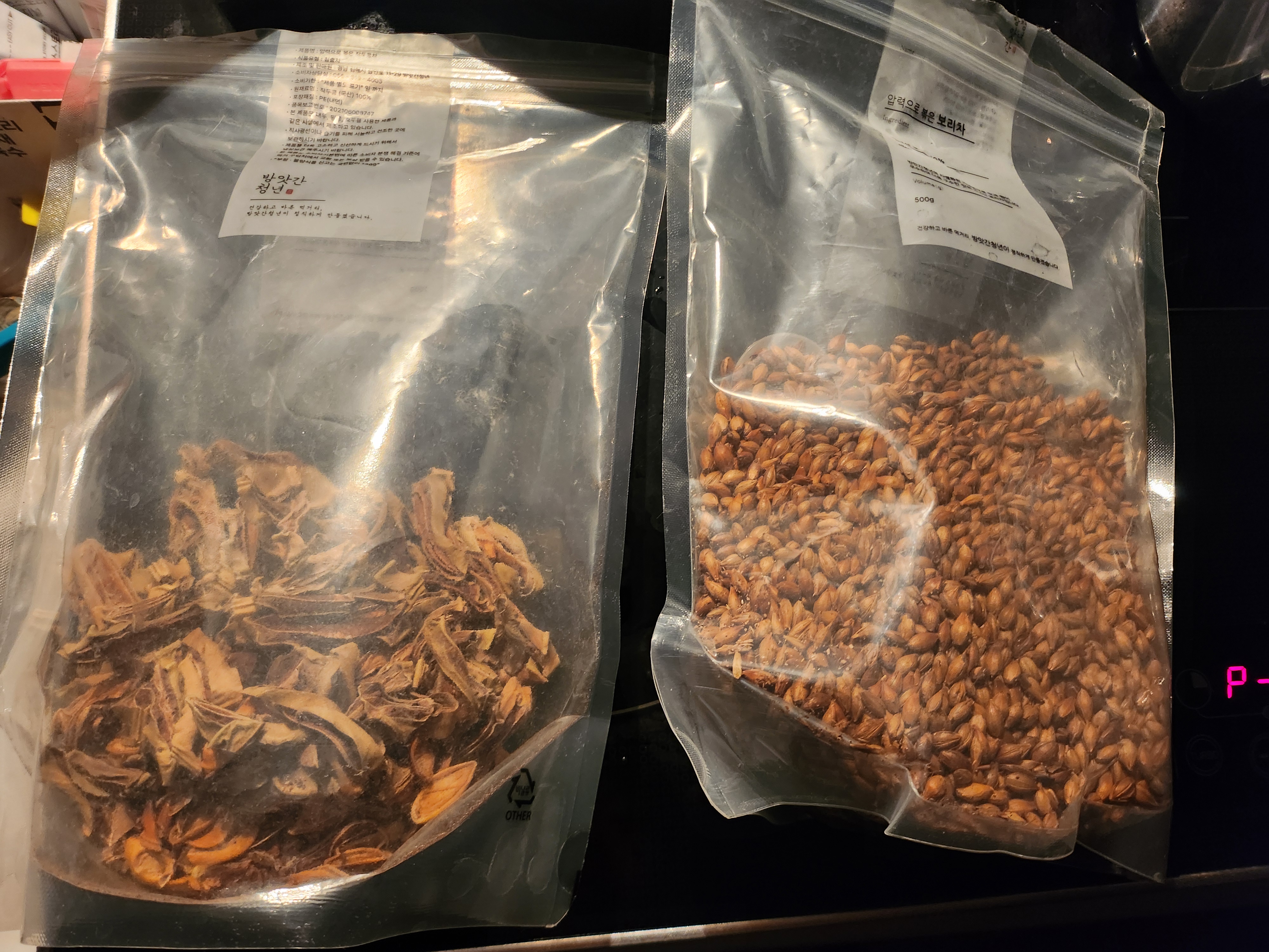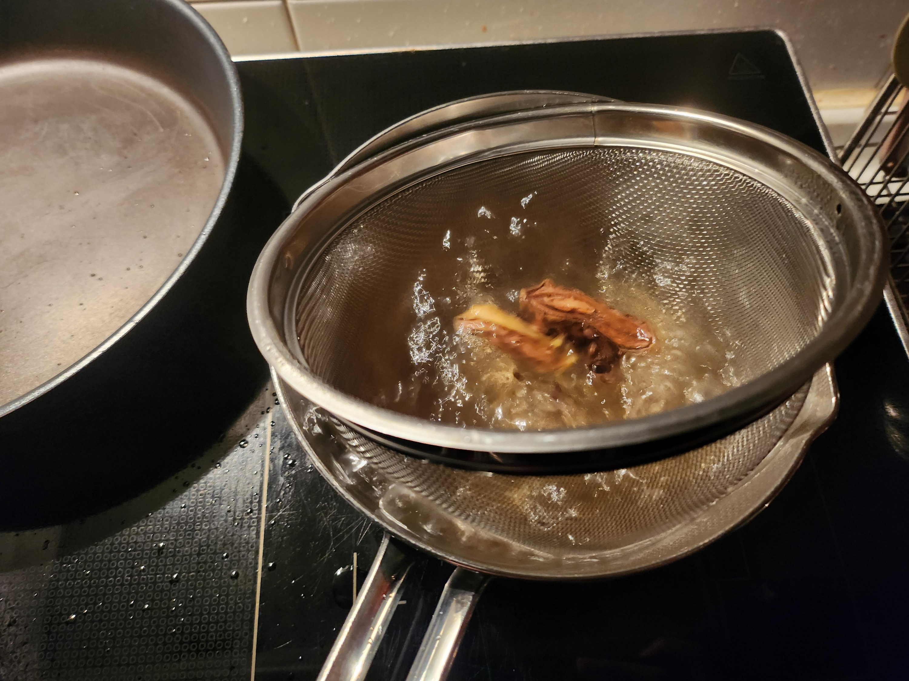 작두콩 2개와 보리 1숟가락을 망에 넣고 5분정도 끓입니다.