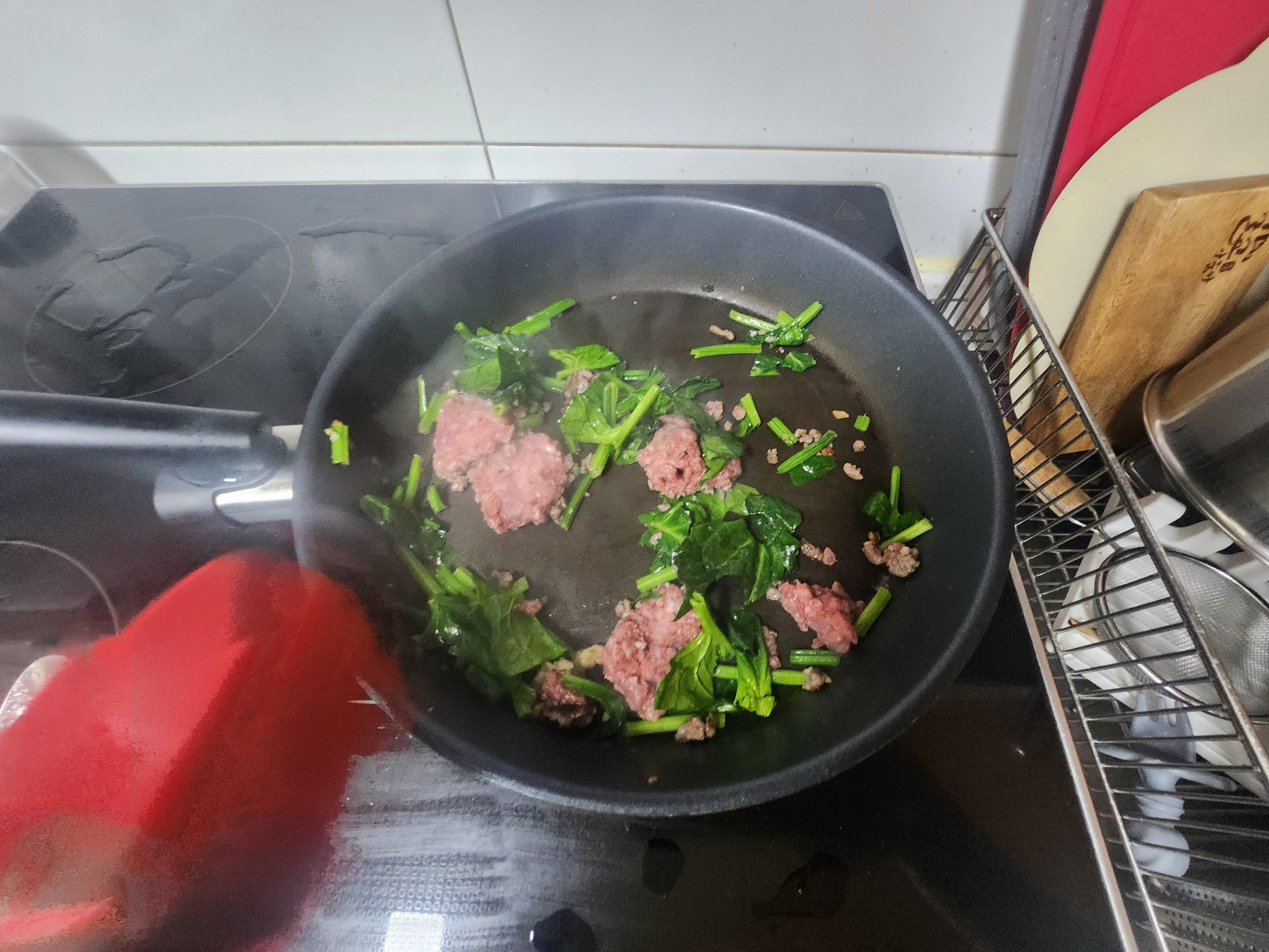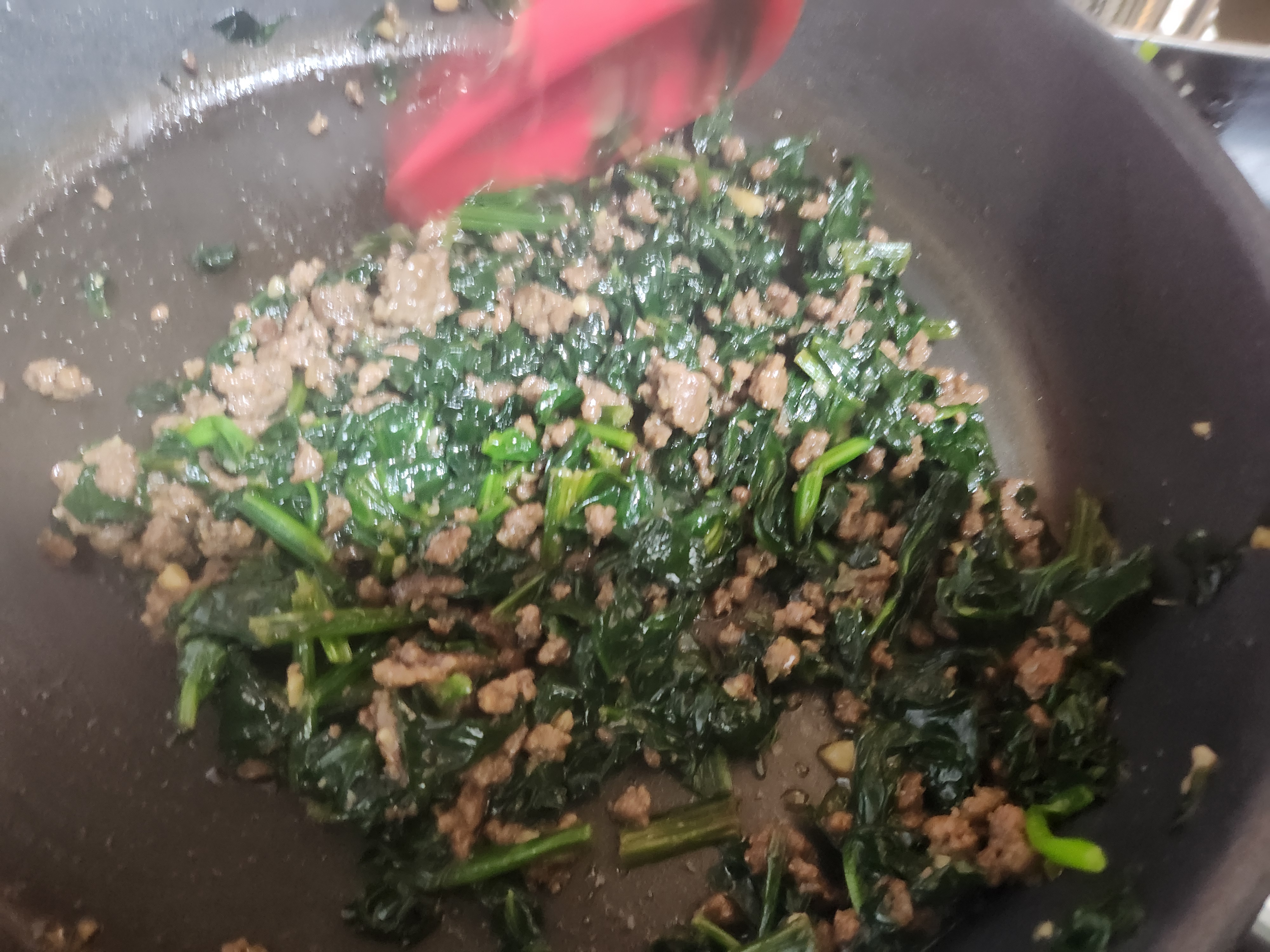 아기들 반찬으로 시금치 소고기 볶음을 했습니다.
