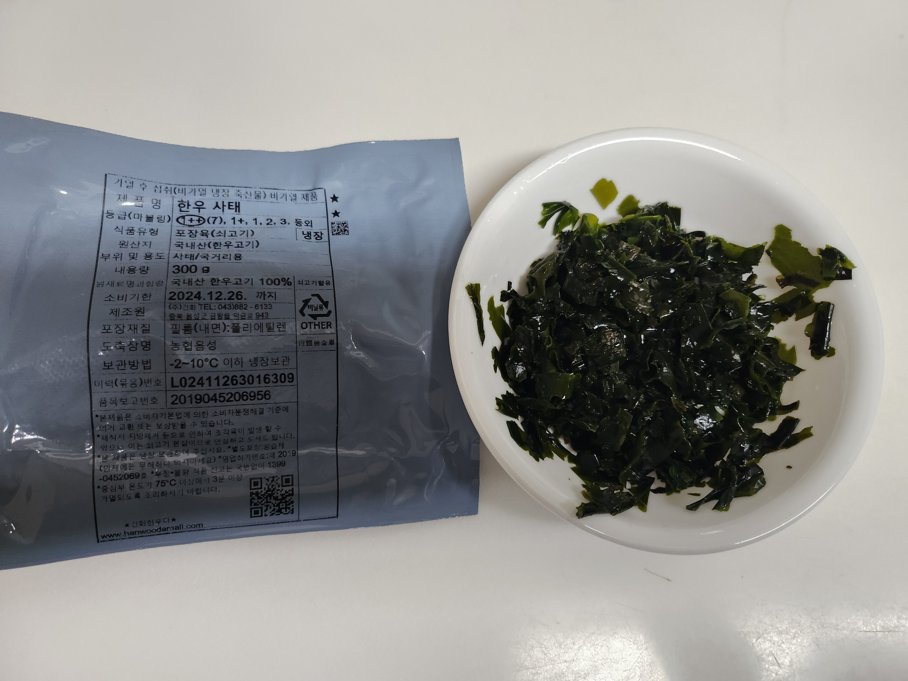 물에 불린 미역을 먹기 좋게 잘랐습니다.