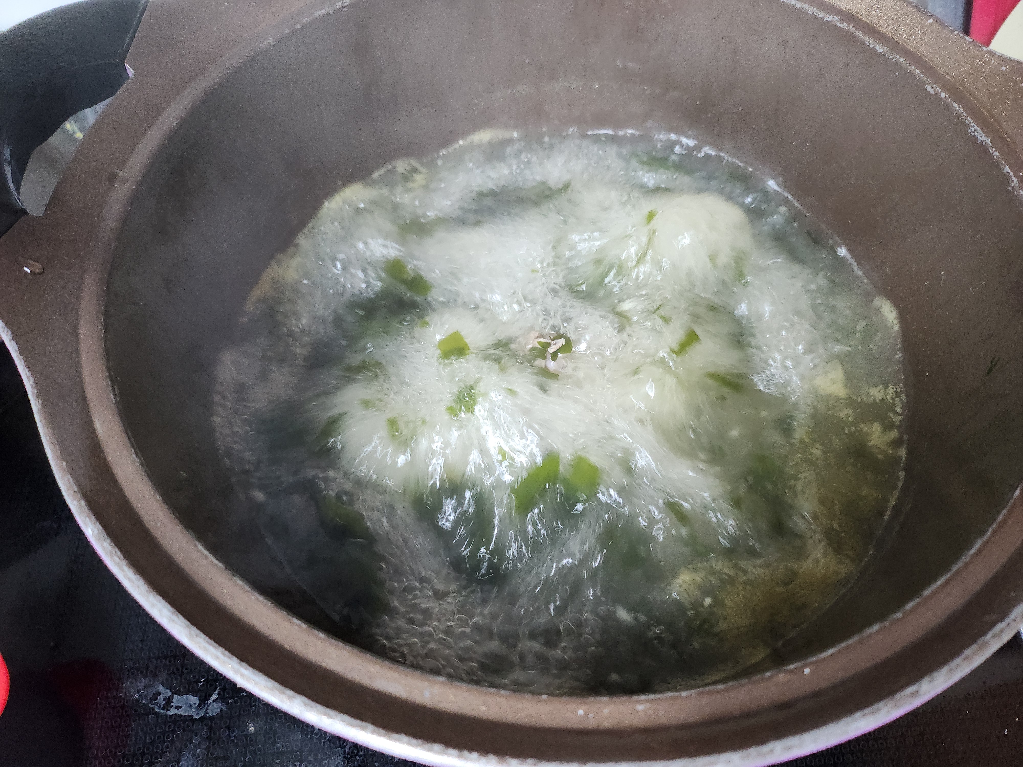 참기름에 미역을 볶다가 물과 국간장을 넣고 육수 가루와 다진 마늘을 넣었습니다.