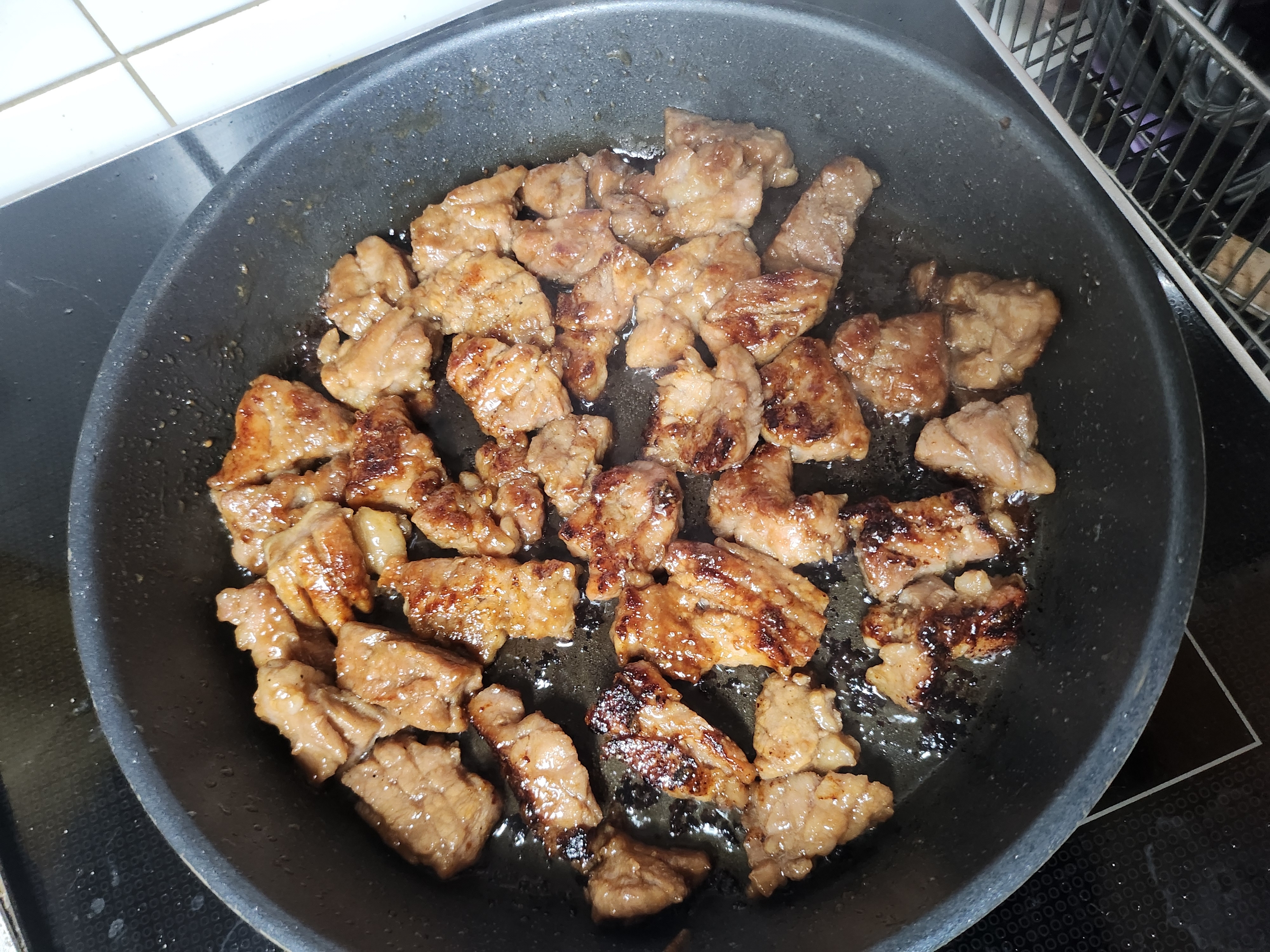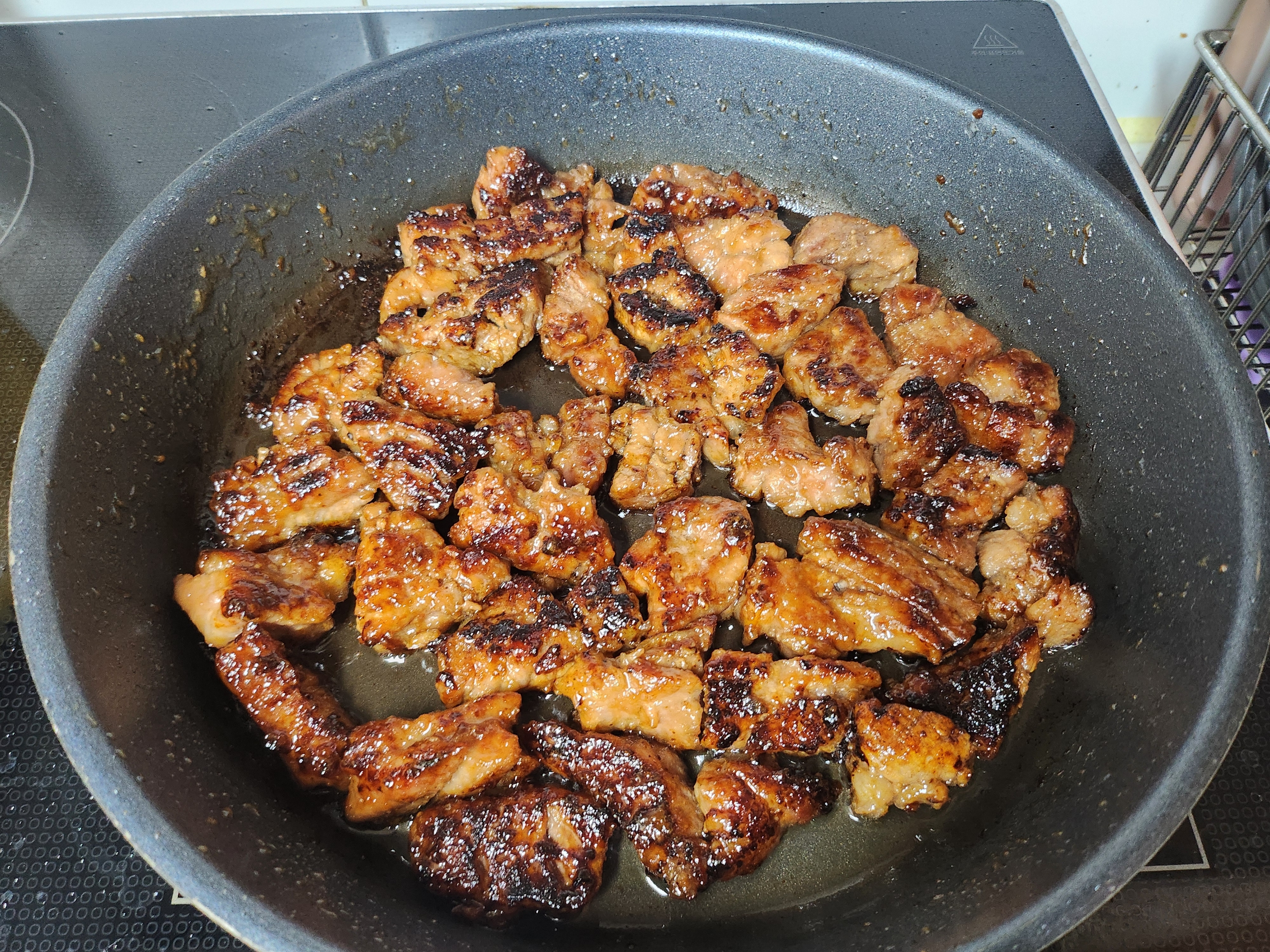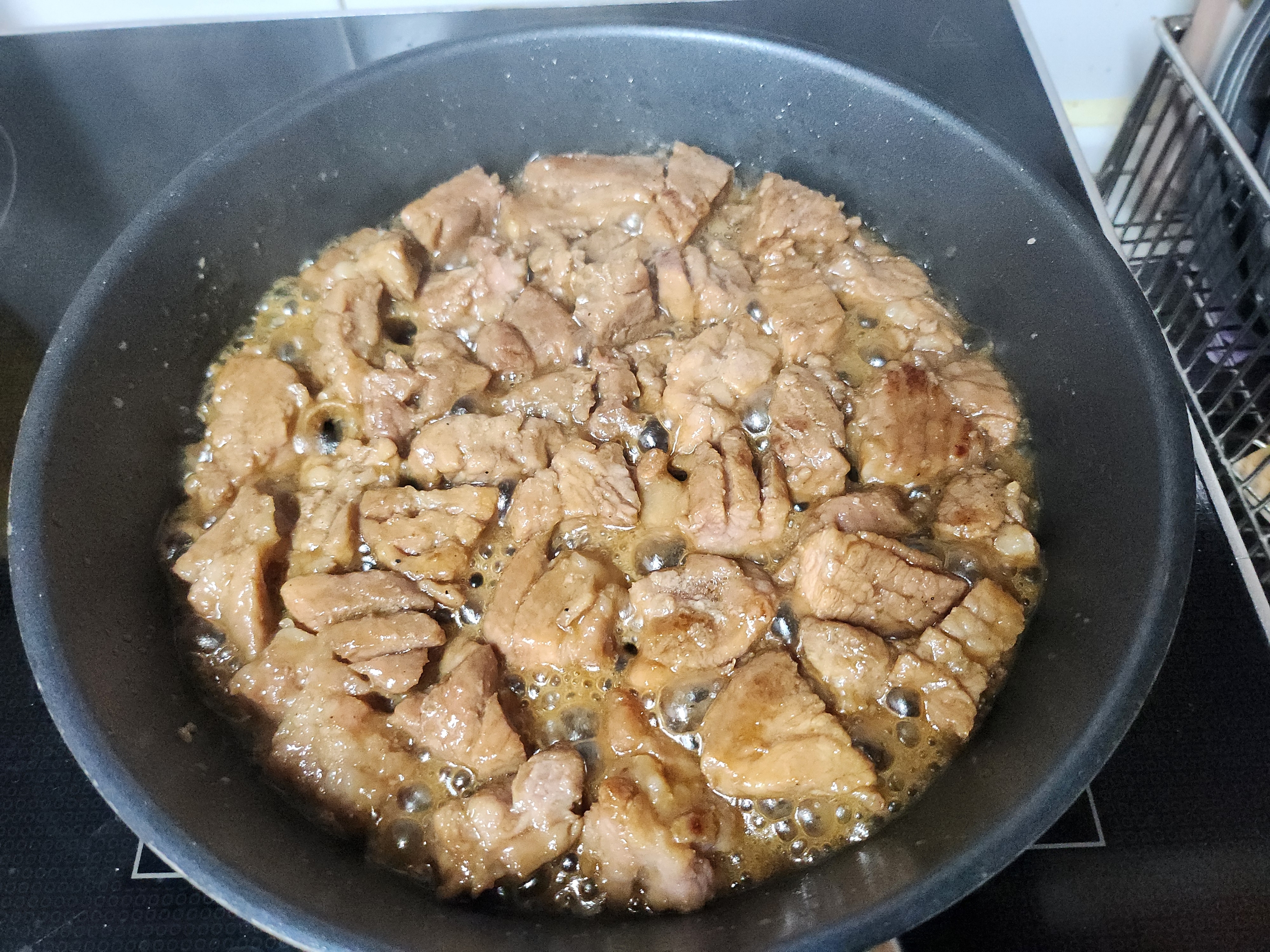 양념이 볶아지면서 고기 표면은 검게 달라붙어 숯불에 구운 것처럼 됩니다