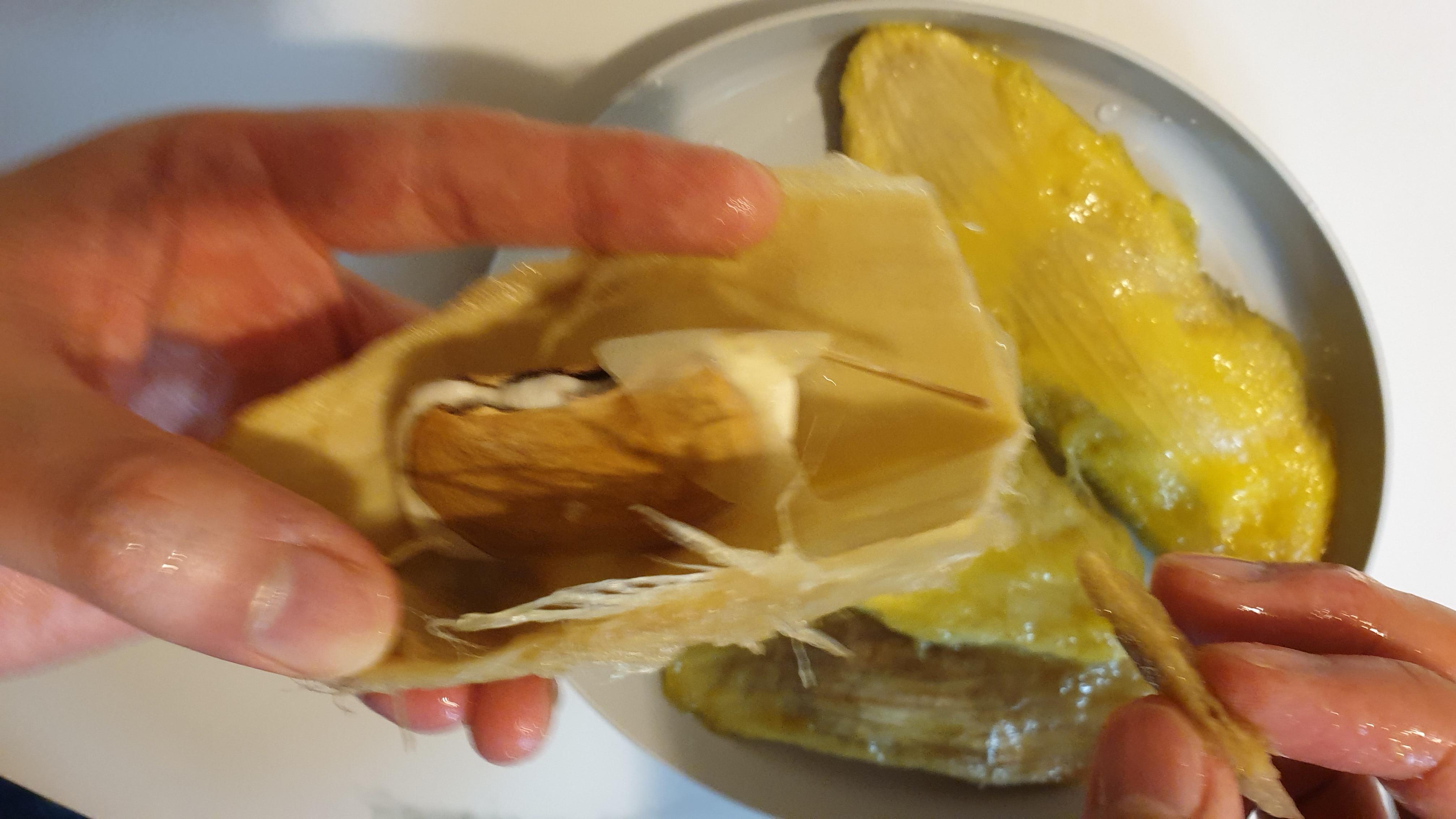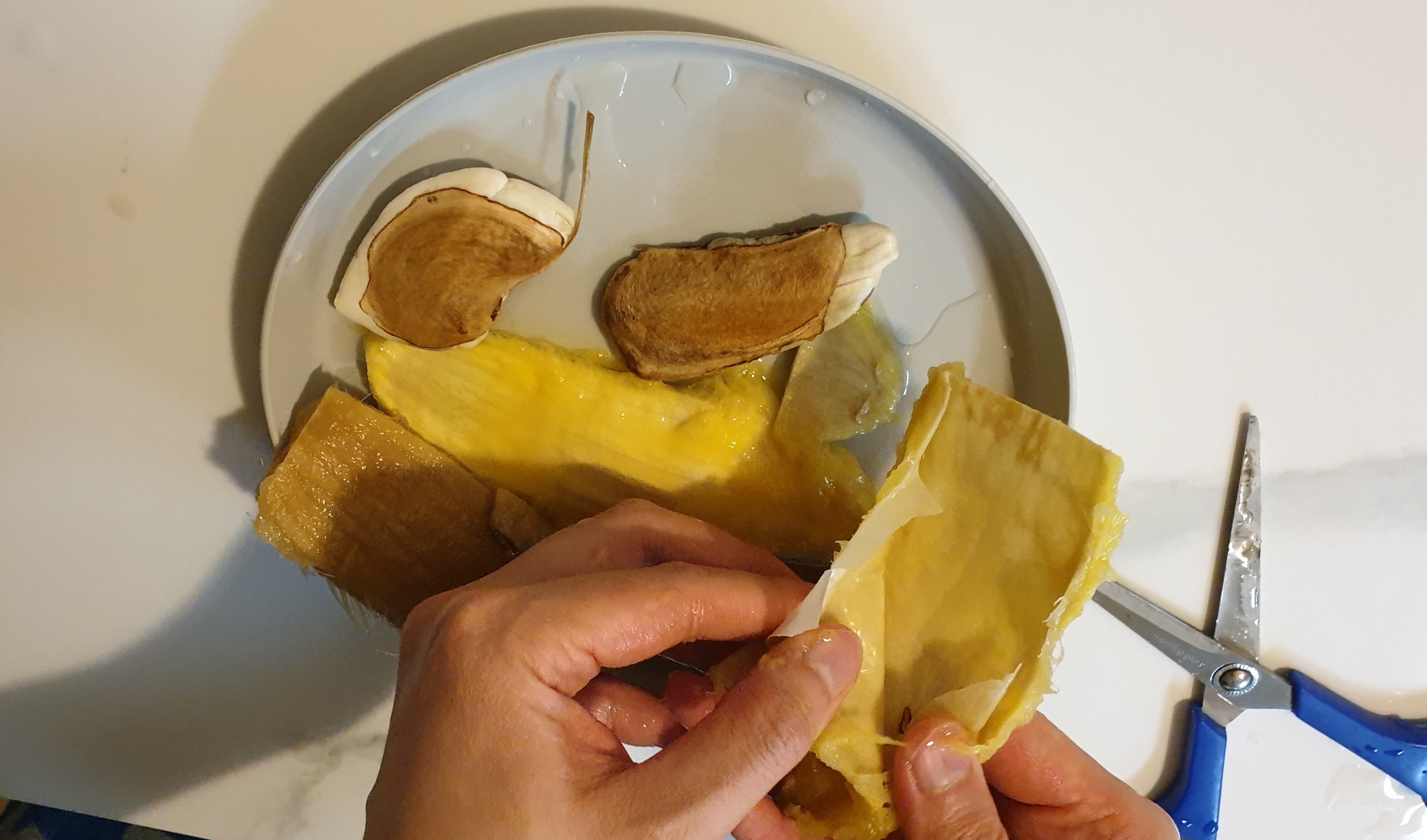 끝을 가위로 잘라주시고 껍질을 벗기면 납작하고 못생긴 씨앗이 나옵니다.