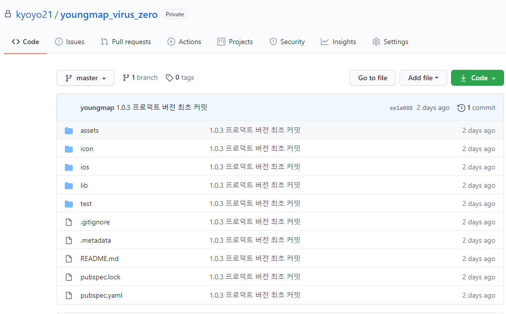 아래 그림처럼 youngmap_virus_zero 플러터 프로젝트가 하나있고,