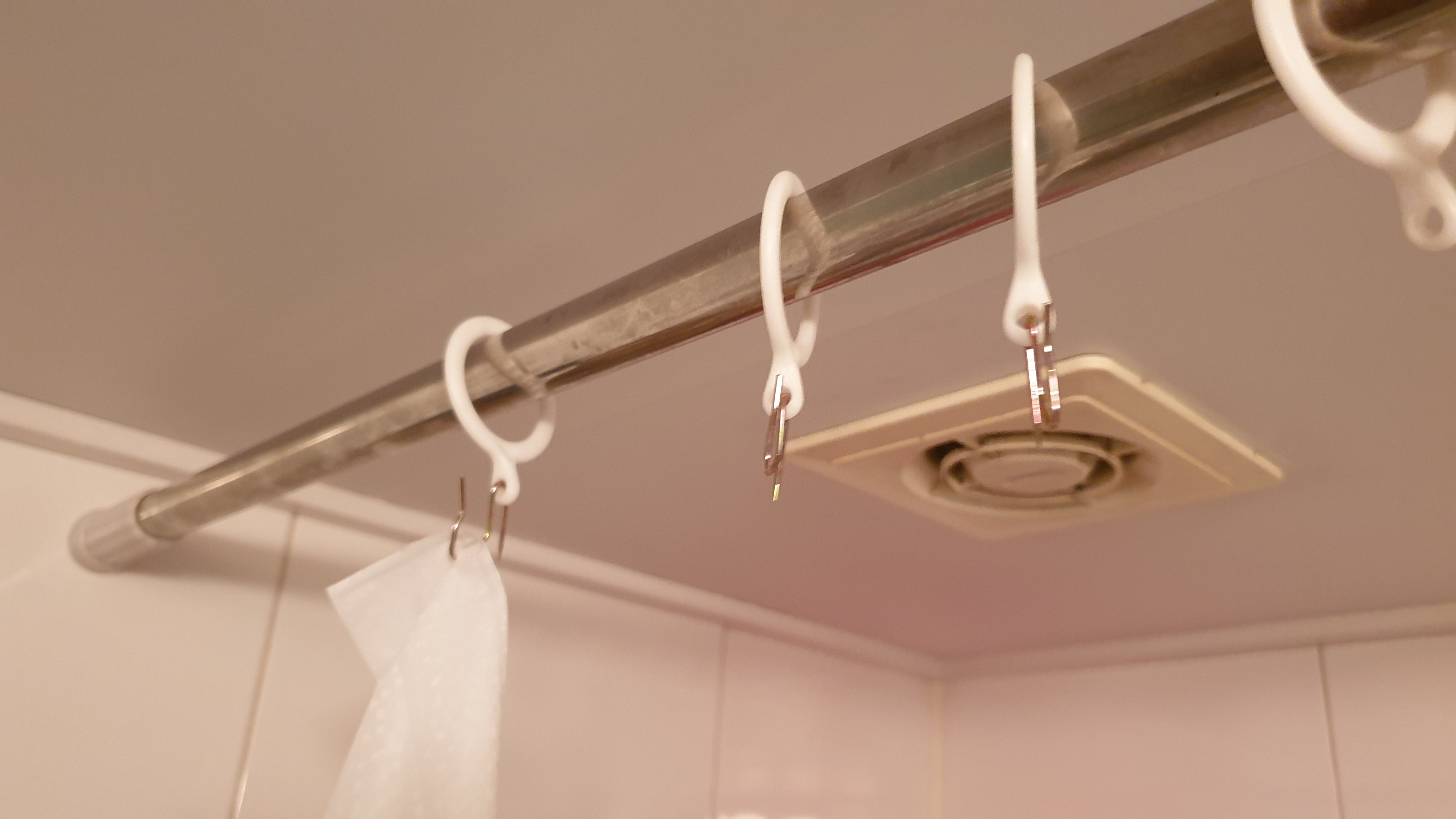 샤워 커튼 상단에는 12개의 구멍이 있었고 우연히도 커튼봉에도 12개의 고리가 있었다.