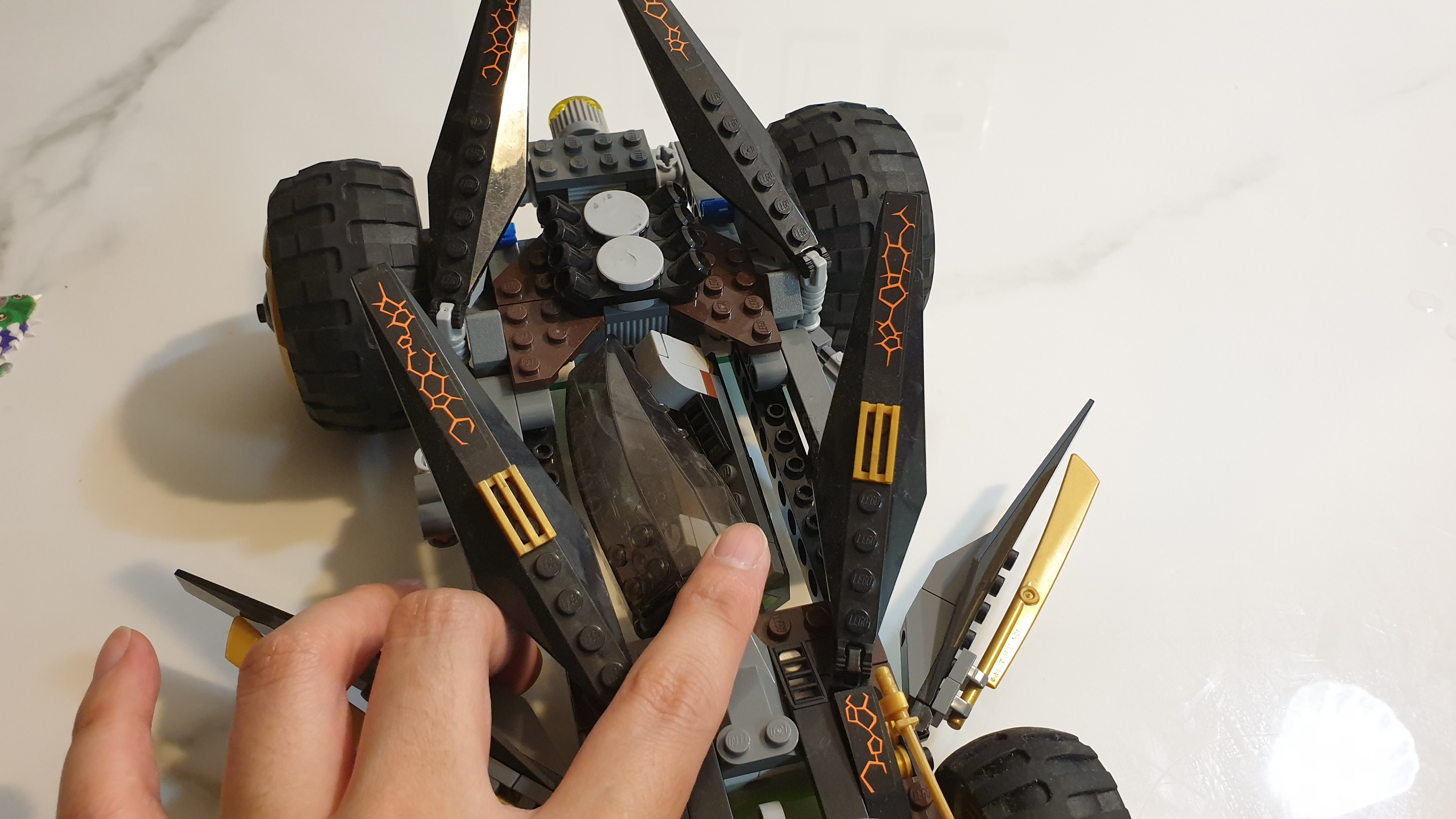 차를 뒤집으면 숨겨있던 초록색 부품이 모습을 드러내며 초록색 자동차가 됩니다.