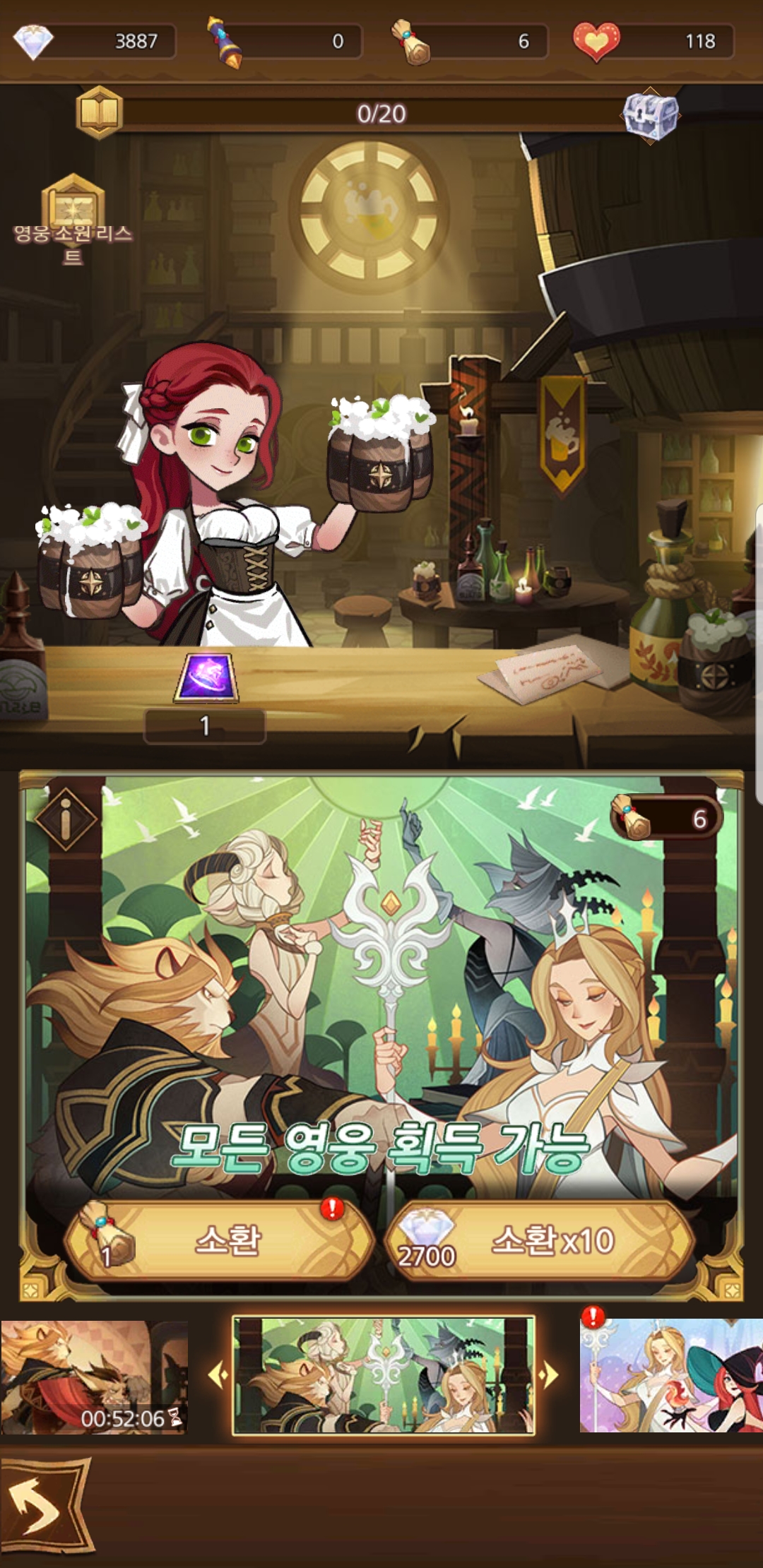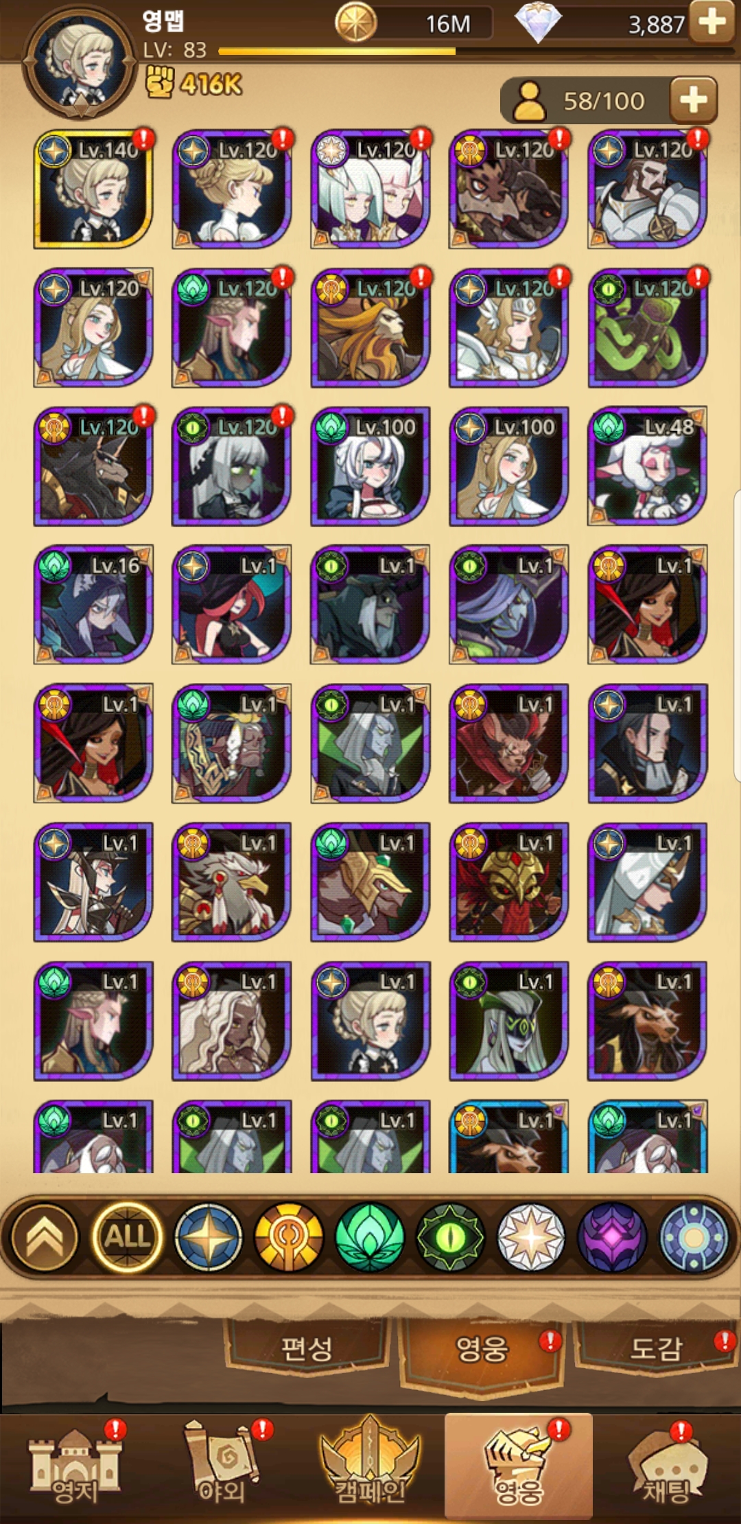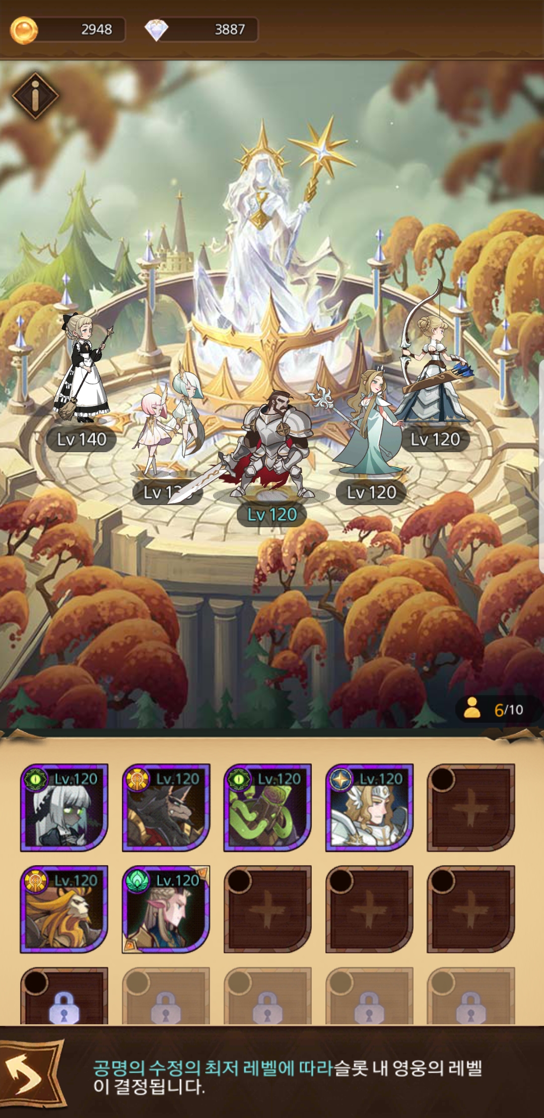 공명의 수정이란 곳에서 방금 뽑은 영웅을 등록하면 슬롯 내 최소 레벨 기준으로 레벨을 올려준다.