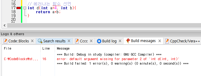 이유는 d(1); 이라고 호출하면 매개변수 a가 채워지는데 b는 디폴트 값이 없기 때문에 명확하지 않아 에러가 납니다.