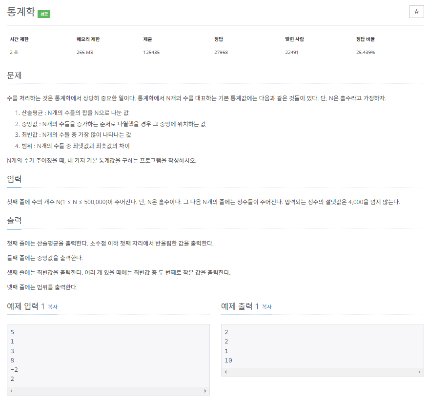 백준 2108번 통계학 문제를 풀면서 각 언어별로 평균, 중위값, 최빈값, 범위를 구하는 알고리즘을 알아봅시다.