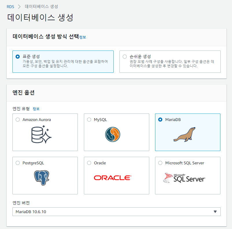 3. 표준 생성을 선택합니다. DB는 MariaDB를 선택했습니다.
