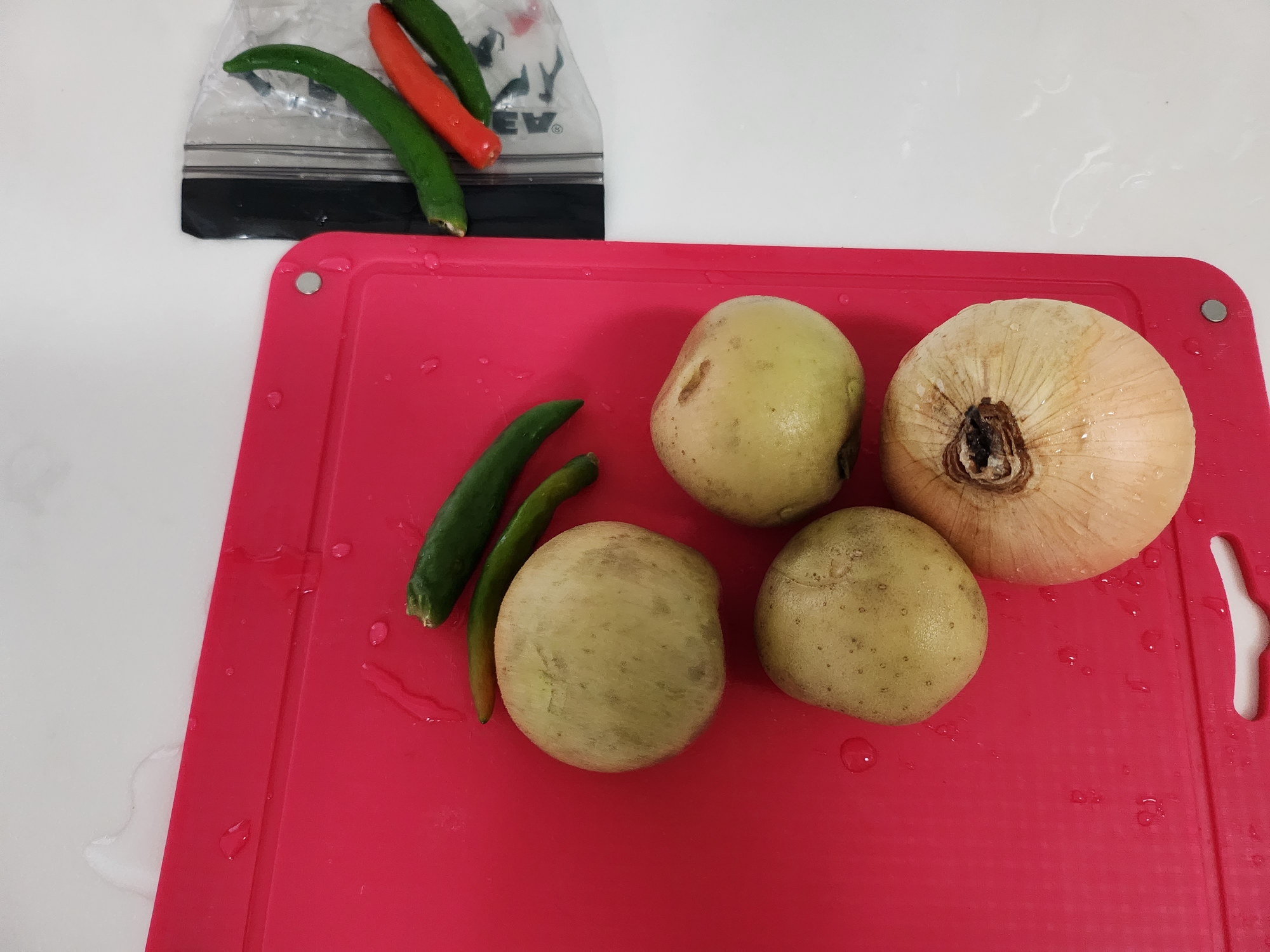 감자, 양파, 청량고추를 먹기 좋게 자릅니다.