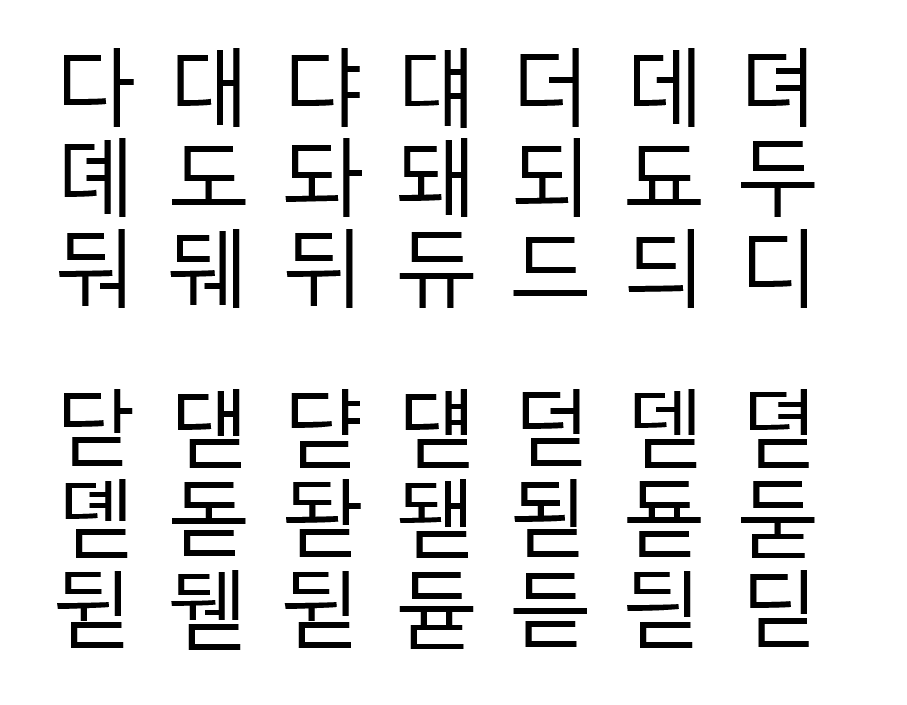 글씨 쓰기를 빠르고 잘 쓰려면 오른쪽처럼 디귿을 써서 자리를 확보하고 마지막에 가운데를 긋는 것도 좋은 방법 같습니다.