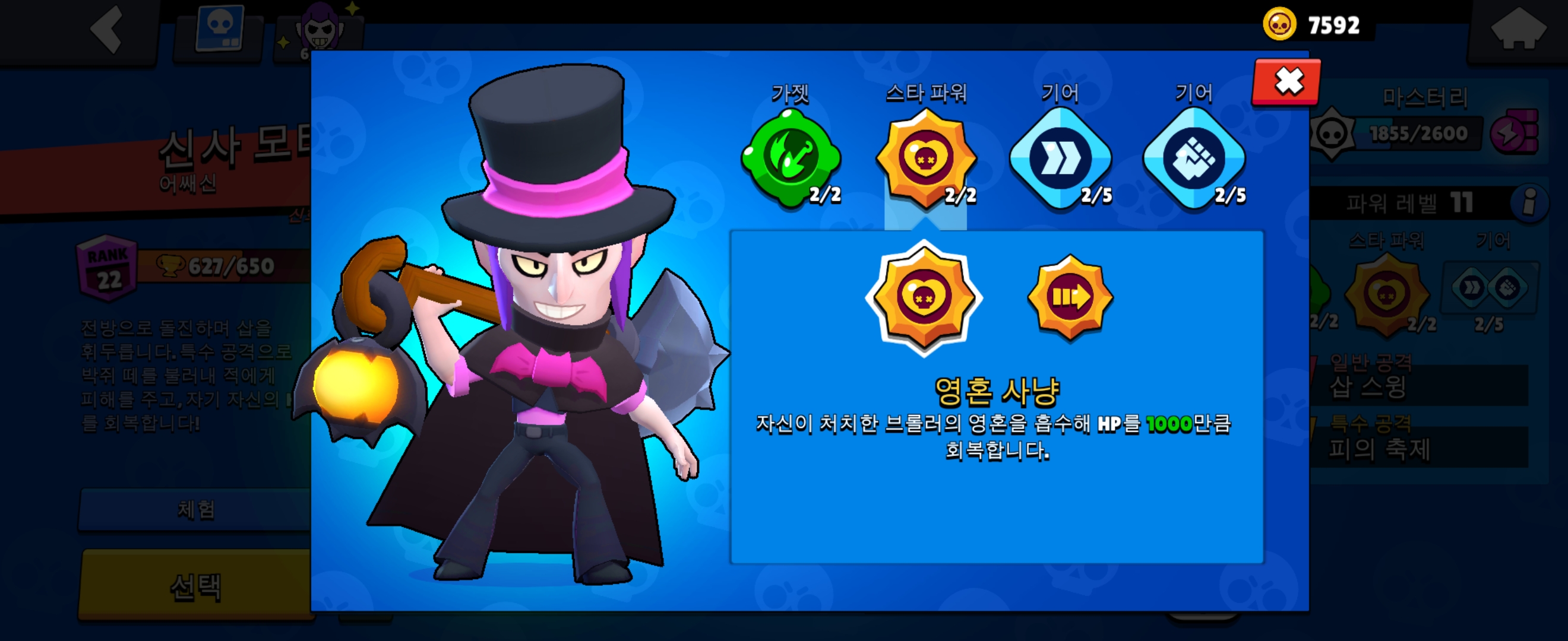 스타파워 1번은 영혼 사냥으로 처치하면 체력을 1000 회복하는 스킬입니다.