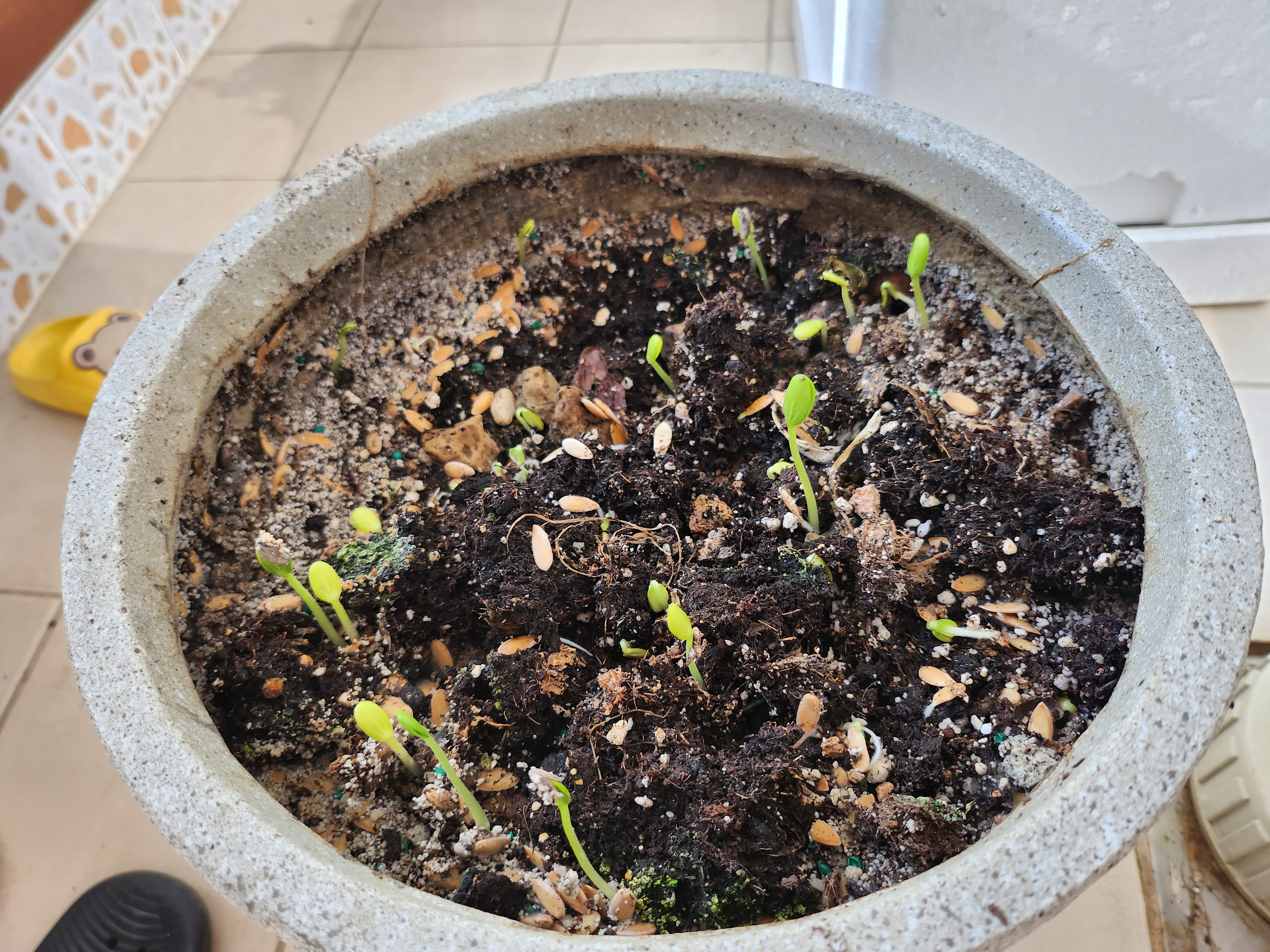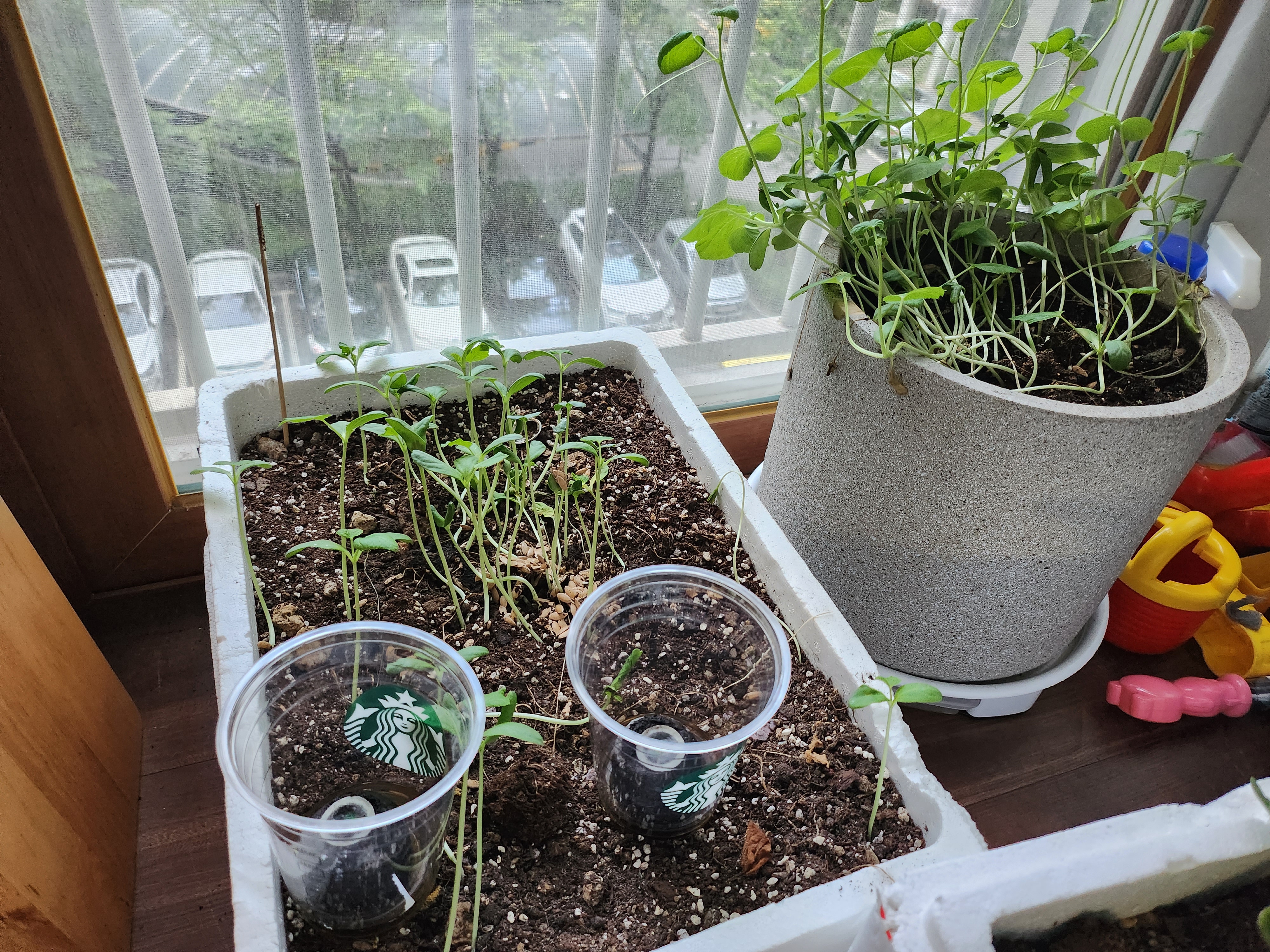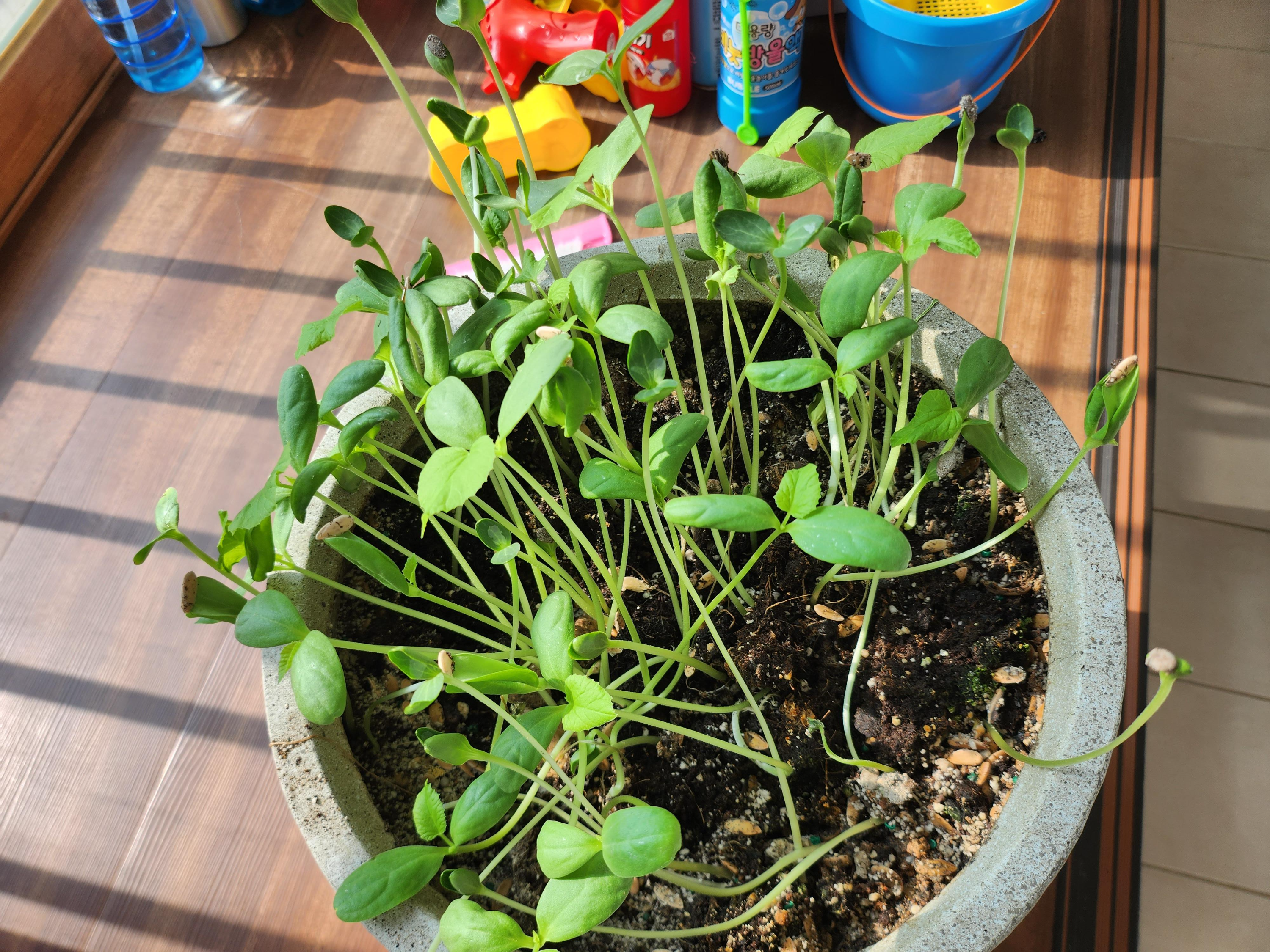 씨를 심었다기보단 첫째와 장난을 친다고 화분에 씨앗을 올리고 물을 잔뜩 뿌려주었습니다.