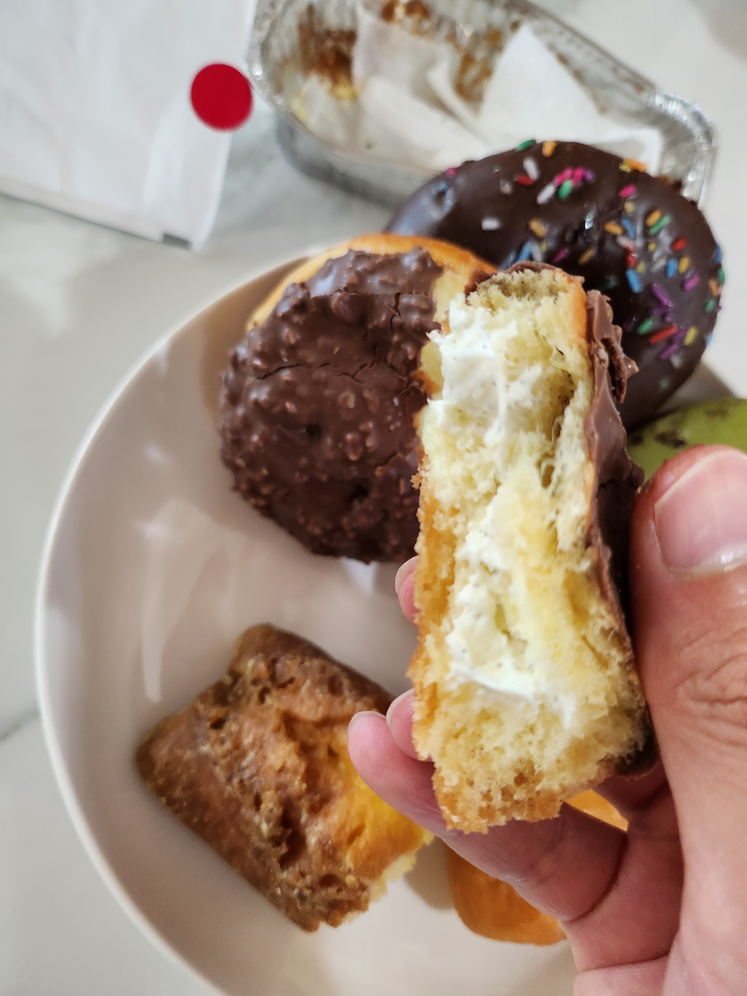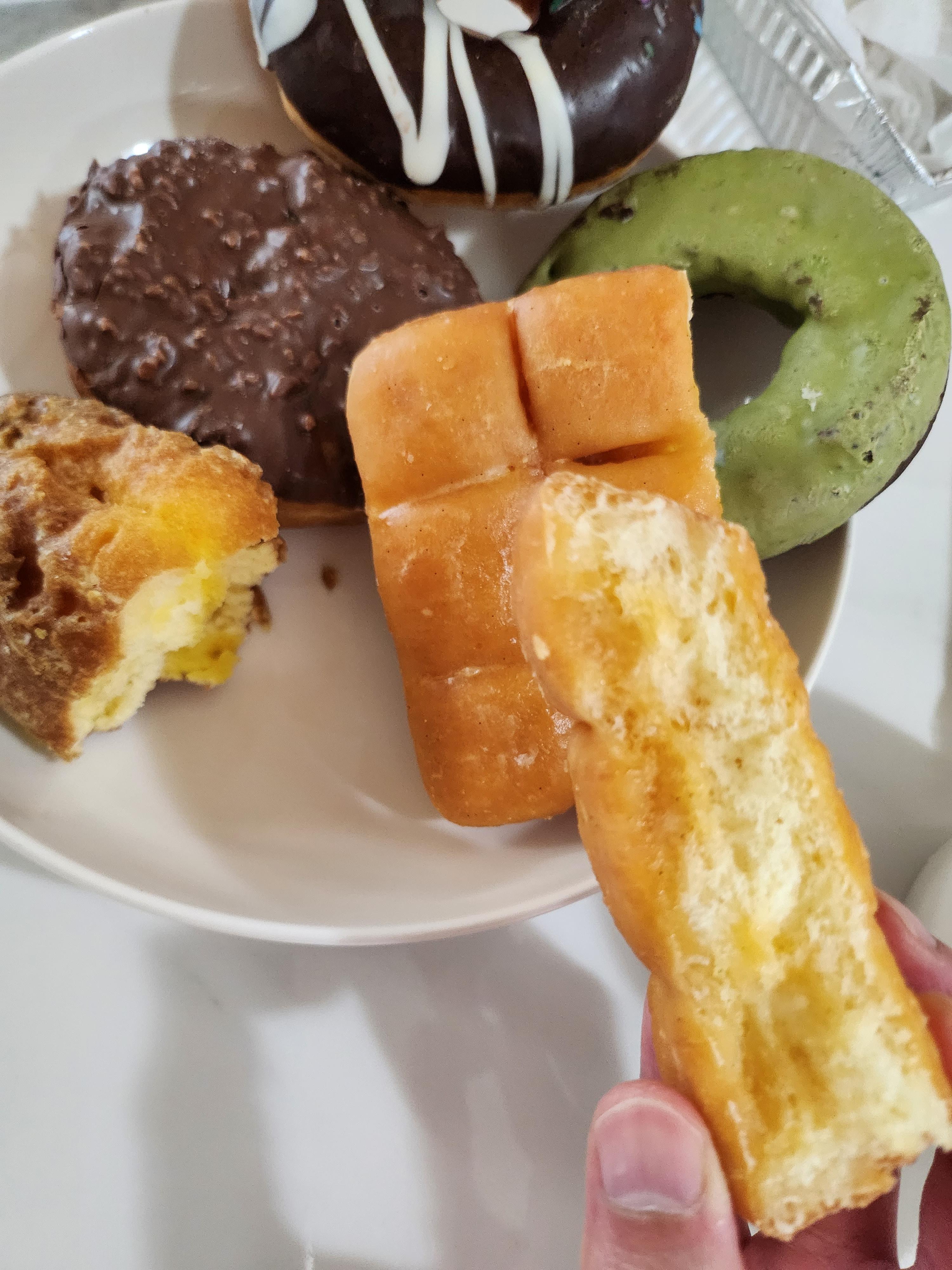 도넛 위에는 헤이즐넛 초콜릿이 덮여있고 속에는 진득한 바닐라 버터크림이 있습니다.