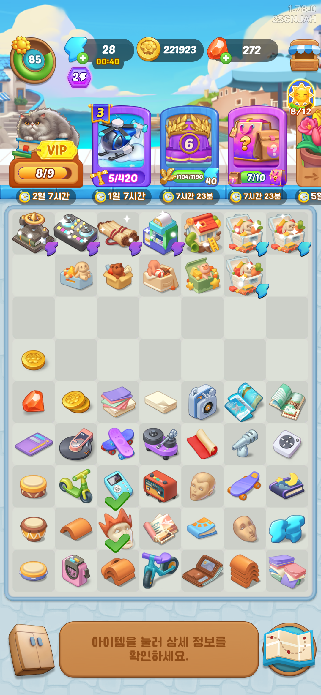 7×9 보드판에서 아이템을 합성하여 손님에게 원하는 제품을 내어줍니다.
