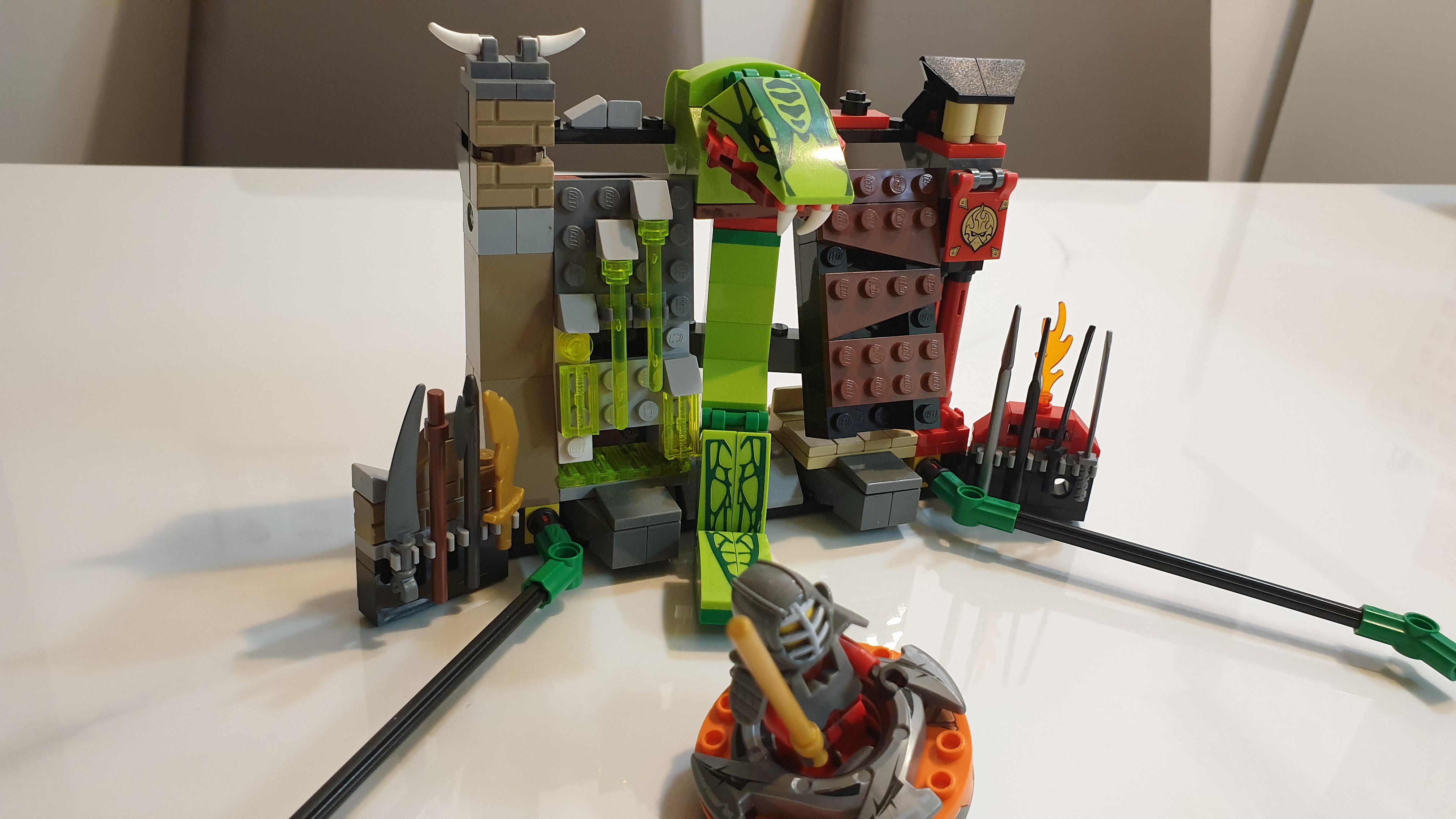 뱀이 꼬리를 양옆으로 흔들면 벽이 앞으로 밀리면서 숨겨진 창이 튀어나옵니다.